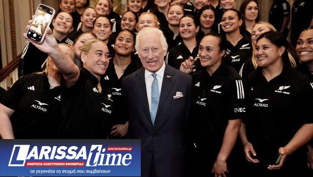 Ο Κάρολος φωτογραφήθηκε μαζί με τις αθλήτριες από τη Νέα Ζηλανδία, με τον ίδιο να βρίσκεται στη μέση και την γαλανόλευκη γραβάτα να είναι σε πρώτο πλάνο.