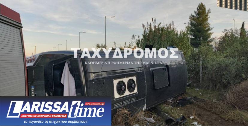 Συνολικά 13 επιβαίνοντες του τουριστικού λεωφορείου που εξετράπη της πορείας του και ανετράπη στην παλιά Εθνική Οδό Βόλου – Λάρισας, στο ύψος κοντά στο κέντρο διασκέδασης «Μέγαρο», μεταφέρθηκαν στο νοσοκομείο του Βόλου για την παροχή πρώτων βοηθειών.