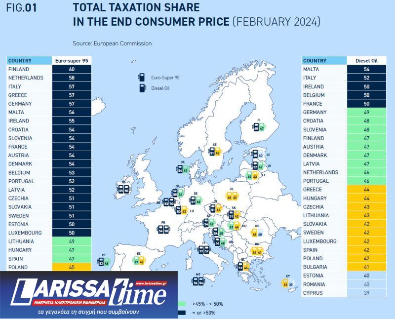 Η Ελλάδα βρίσκεται στην τρίτη θέση -μαζί με την Ιταλία και τη Γερμανία- στην κατάταξη μεταξύ των κρατών-μελών της ΕΕ σε ό,τι αφορά το μερίδιο των φόρων στην τελική τιμή βενζίνης τύπου Euro-super 95, σύμφωνα με τα στοιχεία που παρατίθενται στην ετήσια στατιστική έκθεση της FuelsEurope για το 2024.