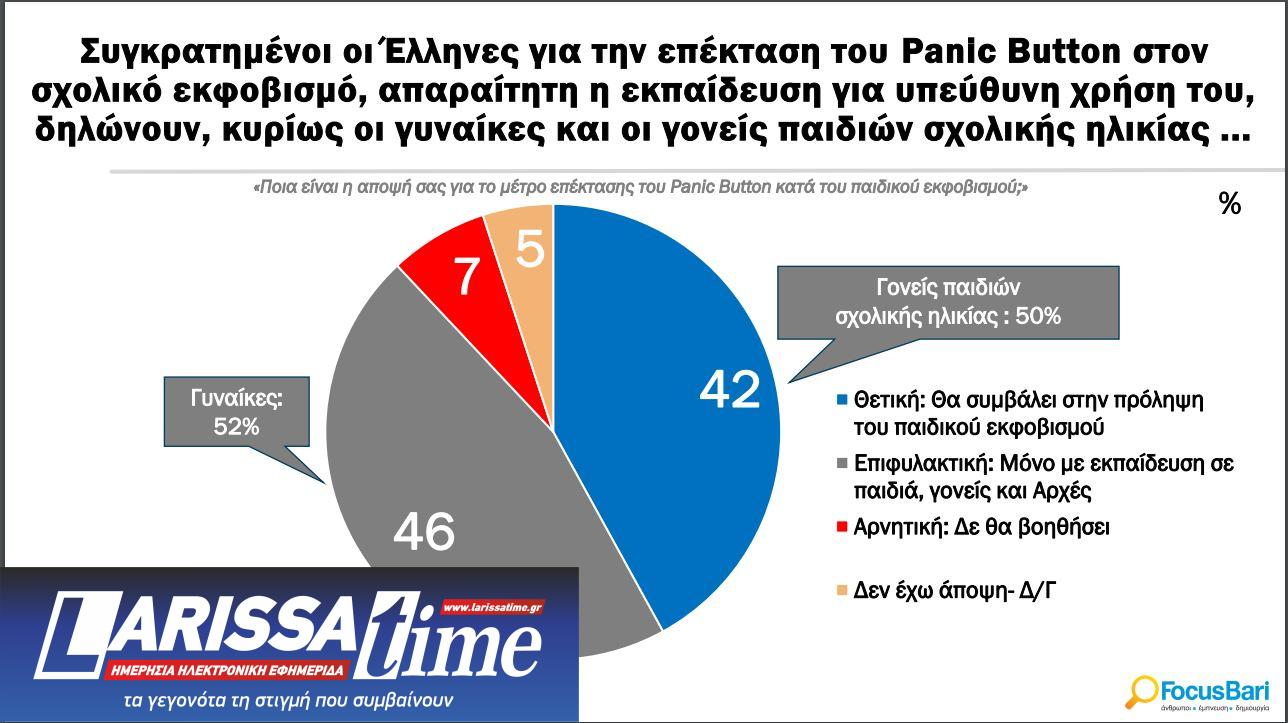 Πάντως ένα σημαντικό ποσοστό 42% – ιδίως γονείς – βλέπει θετικά την επέκταση του «κουμπιού πανικού» για ανηλίκους ως μέτρο κατά του παιδικού εκφοβισμού.