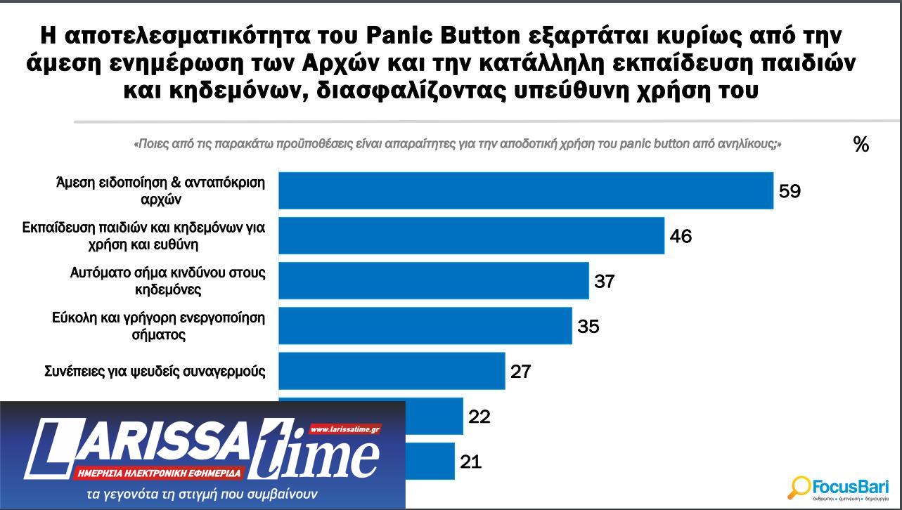 Οι βασικοί παράγοντες για την αποδοτική χρήση του Panic Button από ανηλίκους αναφέρονται η άμεση ειδοποίηση και ανταπόκριση των αρχών και η εκπαίδευση παιδιών και κηδεμόνων (59%, 46%). Σε πολύ χαμηλότερα ποσοστά εκφράζονται ανησυχίες για τη διασφάλιση των προσωπικών δεδομένων (22%), ενώ ένα σημαντικό ποσοστό (37%) ζητάει η εφαρμογή να εκπέμπει αυτόματα σήμα κινδύνου και στους κηδεμόνες.