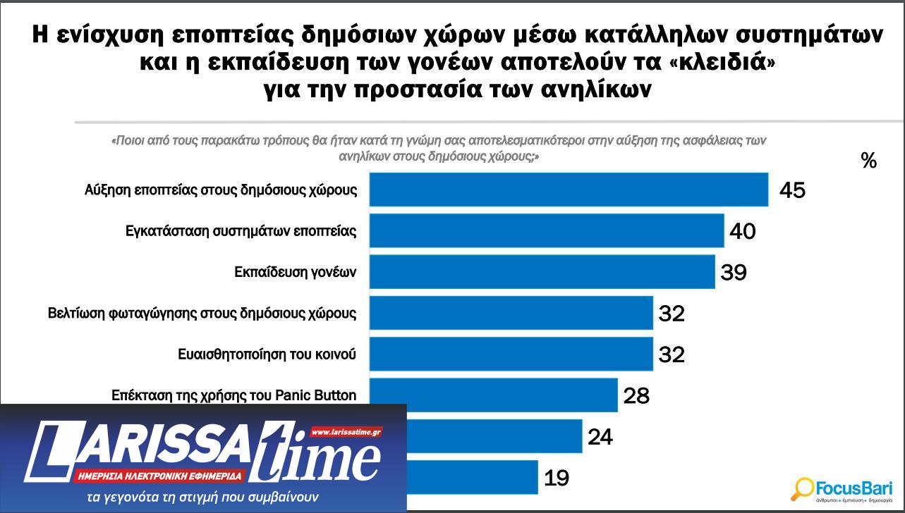 Η «αύξηση εποπτείας» και η «εγκατάσταση συστημάτων εποπτείας» (δηλαδή αστυνομία και κάμερες) είναι οι δύο βασικοί παράγοντες για να κυκλοφορούν οι ανήλικοι με μεγαλύτερη ασφάλεια, απαντούν οι συμμετέχοντες στην έρευνα. Ακολουθεί με υψηλά ποσοστά η εκπαίδευση των γονέων (39%), η βελτίωση της φωταγώγησης και η ευαισθητοποίηση του κοινού (32% αμφότερα). Το Panic Button βρίσκεται χαμηλά στην κατάταξη, με μόλις το 28% των ερωτηθέντων να το θεωρούν σημαντικό.