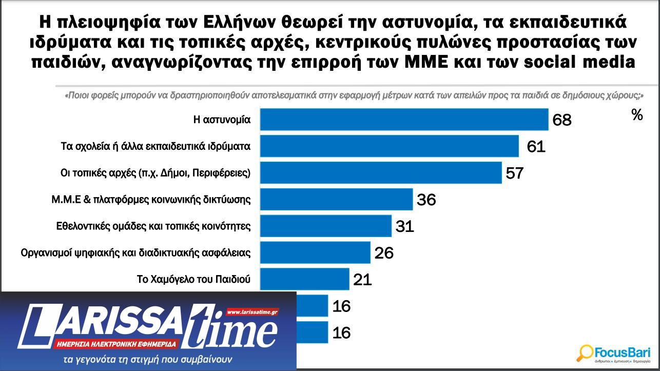Στη κορυφή της λίστας των φορέων που μπορούν να «δραστηριοποιηθούν αποτελεσματικά στην εφαρμογή μέτρων κατά των απειλών προς τα παιδιά σε δημόσιους χώρους», βρίσκεται όπως είναι αναμενόμενο η αστυνομία (68%).