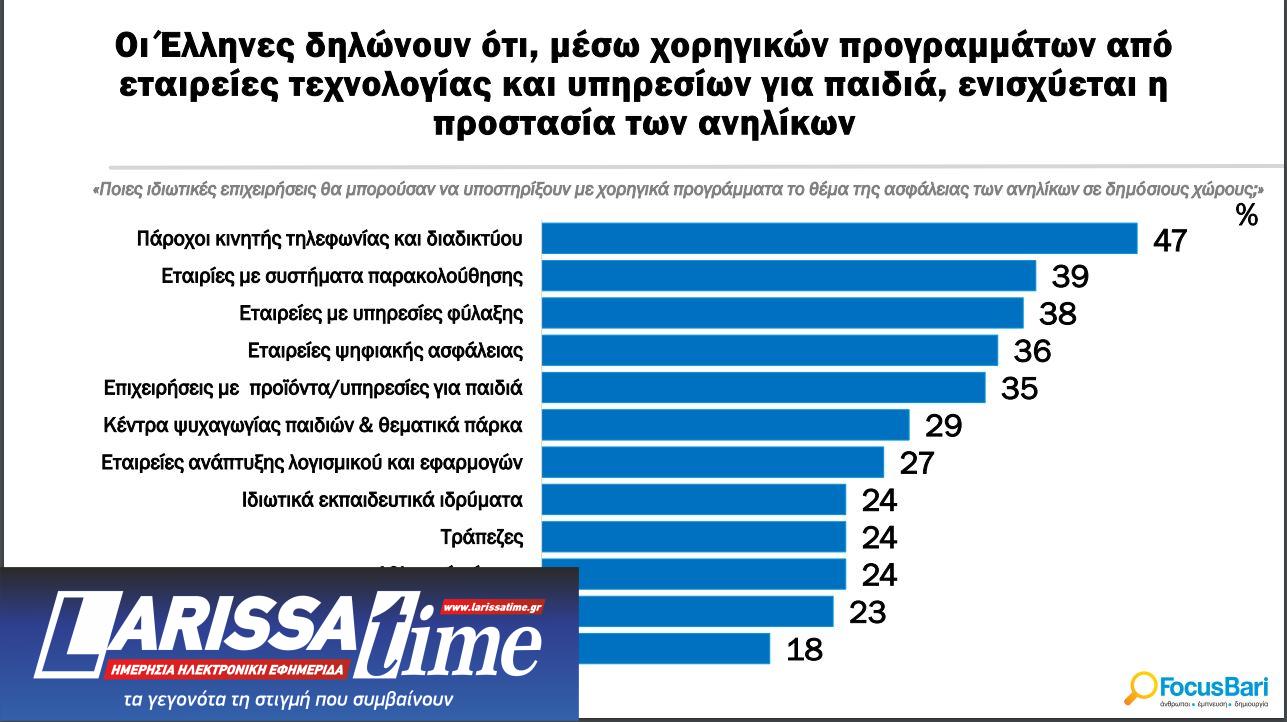 «Περίπου δύο στους τρεις Έλληνες πιστεύουν ότι οι ιδιωτικές επιχειρήσεις, ιδιαίτερα αυτές που δραστηριοποιούνται στον τομέα της τεχνολογίας, έχουν τη δυνατότητα να ενισχύσουν την ασφάλεια των ανηλίκων μέσω χορηγιών για ενημέρωση και πρόληψη» σημειώνει η έρευνα.