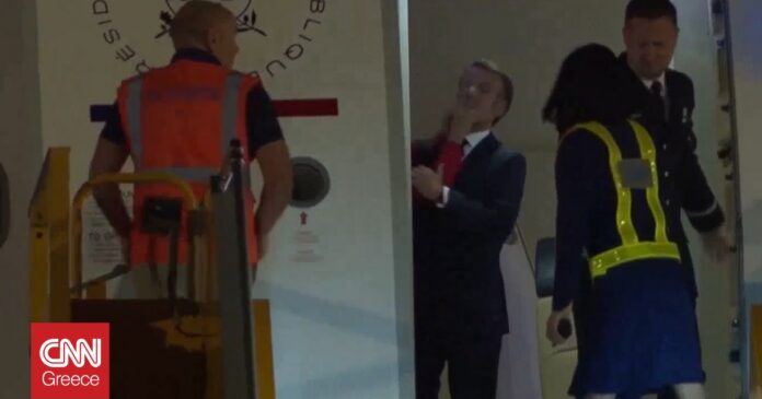 Στα πλάνα βλέπουμε τον Μακρόν να στέκεται στην έξοδο του προεδρικού αεροσκάφους που μόλις έχει φτάσει στο Ανόι. Από τα αριστερά της ανοιχτής πόρτας διακρίνονται επίσης τα χέρια της συζύγου του να σπρώχνουν το πρόσωπό του, με τον ίδιο μόλις αντιλαμβάνεται ότι τον έχουν καταγράψει οι κάμερες να «παγώνει» ακαριαία και να χαιρετάει.