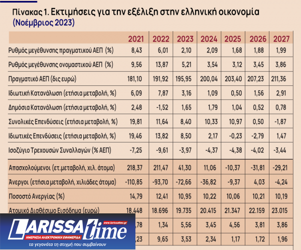 Πίνακας 1. Εκτιμήσεις για την εξέλιξη στην ελληνική οικονομία (Νοέμβριος 2023)