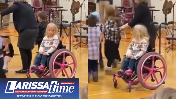 Τα υπόλοιπα παιδιά τραγουδούσαν και χόρευαν μαζί στον κύκλο, ενώ το κοριτσάκι στο αναπηρικό αμαξίδιο καθόταν στο ίδιο σημείο όλη την ώρα, κοιτάζοντας τους συμμαθητές της να διασκεδάζουν και να χαίρονται.