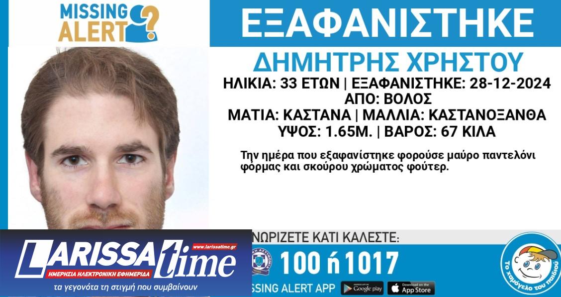Για έκτη ημέρα αγνοείται 33χρονος στον Βόλο, για τον οποίο έχει εκδοθεί missing alert, με την οικογένειά του να αγωνιά για την τύχη του. Εξαφανίστηκε στις 28 Δεκεμβρίου, στις 12:10 το μεσημέρι.