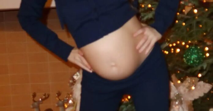 Η Instagrammer δημοσίευσε φωτογραφίες με φουσκωμένη κοιλιά μπροστά από το χριστουγεννιάτικο δέντρο στο σπίτι της.