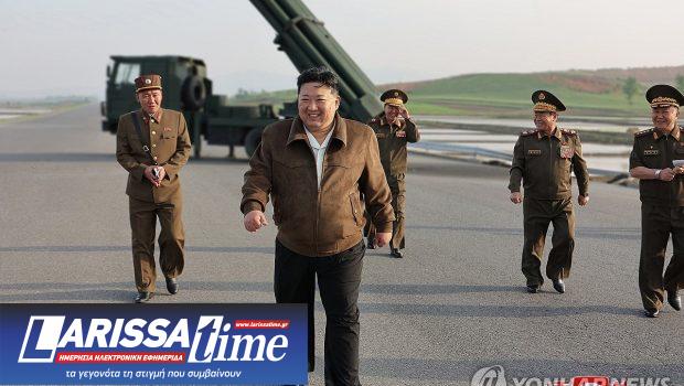 Ο ηγέτης της Βόρειας Κορέας Κιμ Γιονγκ Ουν επιθεώρησε χθες Παρασκευή συστήματα πολλαπλών εκτοξευτών πυραύλων (MLRS) και παρακολούθησε άσκηση με δοκιμαστικές βολές των συγκεκριμένων οπλικών συστημάτων (φωτογραφία, επάνω, από το KCNA).