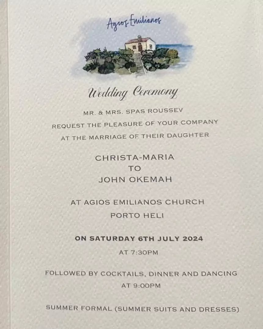 Η Christa-Maria και ο John Okemah θα ανταλλάξουν όρκους αιώνιας αγάπης στο γραφικό εκκλησάκι του Αγίου Αιμιλιανού στο Πόρτο Χέλι, ακριβώς στις 19:30. Το dress code για την εκδήλωση θα είναι «Summer Formal».
