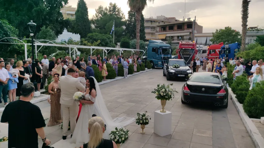Σύμφωνα με το korinthostv.gr, ο Γιάννης και η Νατάσσα αποφάσισαν να αφήσουν το δικό τους στίγμα στην ημέρα του γάμου τους, με τον κύριο Ταταράκη να έχει την ιδέα που εντυπωσίασε: μια πομπή από φορτηγά αντί για τα συνηθισμένα αυτοκίνητα.