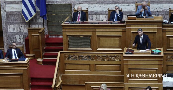 «Να σας συγχαρώ για την εφαρμογή του περιορισμού του χρόνου για τους ομιλητές», ανέφερε ο Κυριάκος Μητσοτάκης ανεβαίνοντας στο βήμα της Βουλής, απευθυνόμενος στον πρόεδρο της Βουλής Νικήτα Κακλαμάνη.