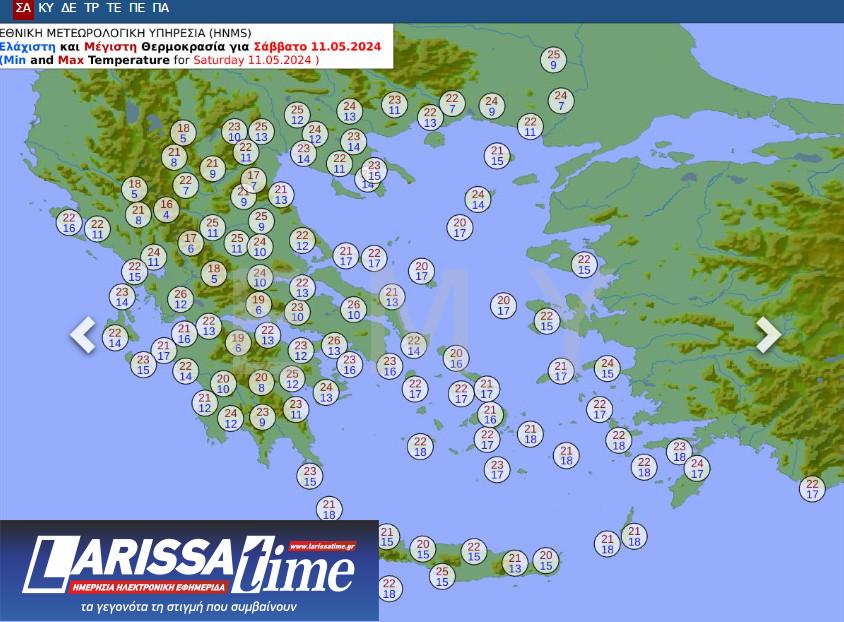Θερμοκρασία: Από 11 έως 22 βαθμούς Κελσίου. Στη δυτική Μακεδονία 2 με 3 βαθμούς χαμηλότερη.