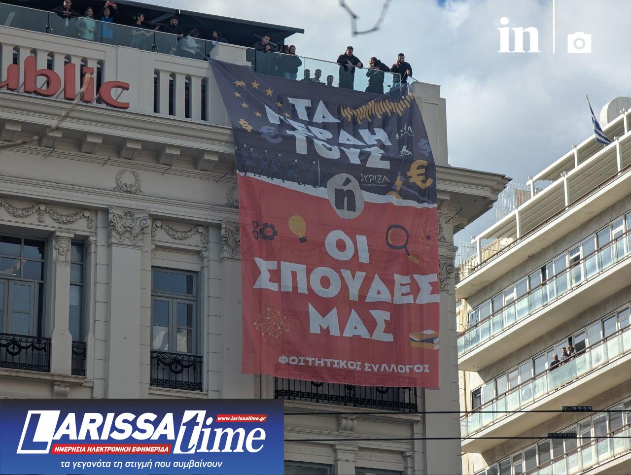 Μάλιστα, ομάδα φοιτητών ανέβηκε στο κτίριο γνωστού πολυκαταστήματος και κρέμασε πανό, στο οποίο αναγράφεται «Τα κέρδη τους ή οι σπουδές μας».