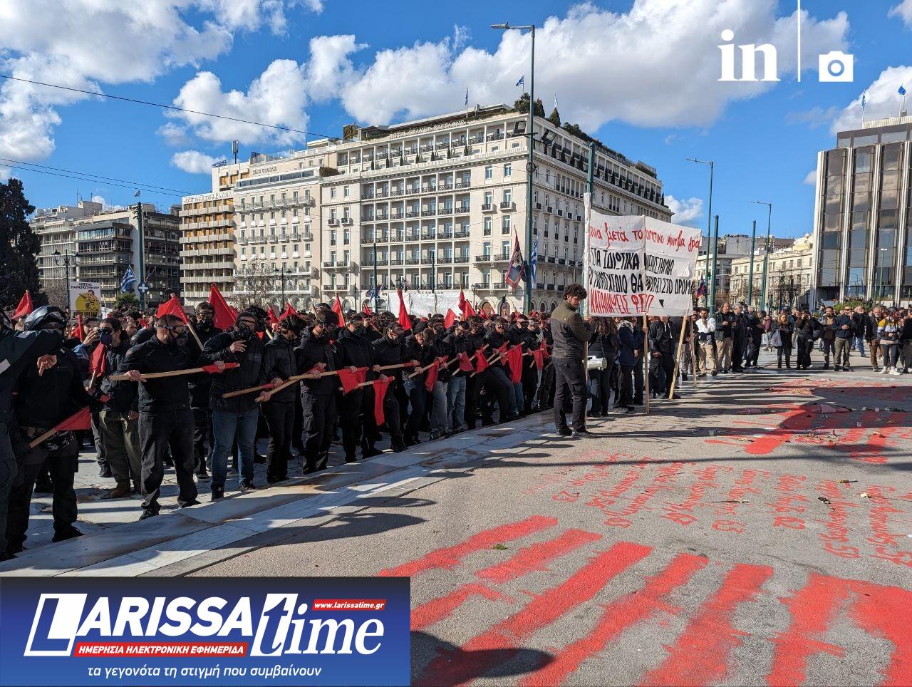 Η πορεία κόπηκε στη μέση και λίγο αργότερα τα μπλοκ ενώθηκαν και πάλι, συνεχίζοντας τη διαδρομή προς τη Βουλή.