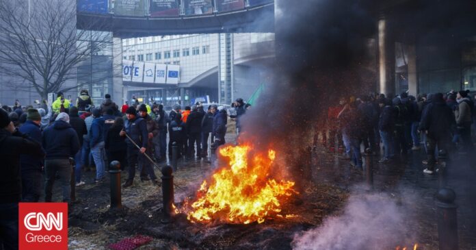Οι τελευταίες εικόνες που φθάνουν από τις Βρυξέλλες δείχνουν εντάσεις με αγρότες να καίνε άχυρα και λάστιχα έξω από το Ευρωπαϊκό Κοινοβούλιο.
