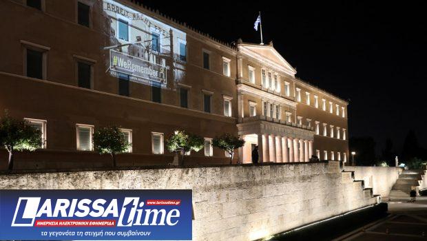 Με το σύνθημα #WE REMEMBER, της Διεθνούς Εκστρατείας για τη Μνήμη του Ολοκαυτώματος, φωταγωγήθηκε το βράδυ της Κυριακής η πρόσοψη του Μεγάρου της Βουλής των Ελλήνων.