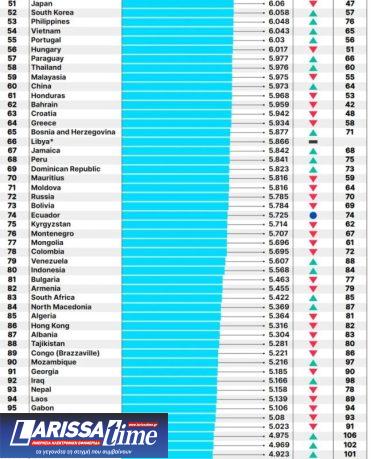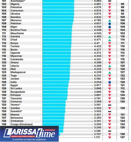 Η Ελλάδα βρέθηκε στην 64η θέση φέτος, με μια υποχώρηση έξι θέσεων σε σύγκριση με το 2023.