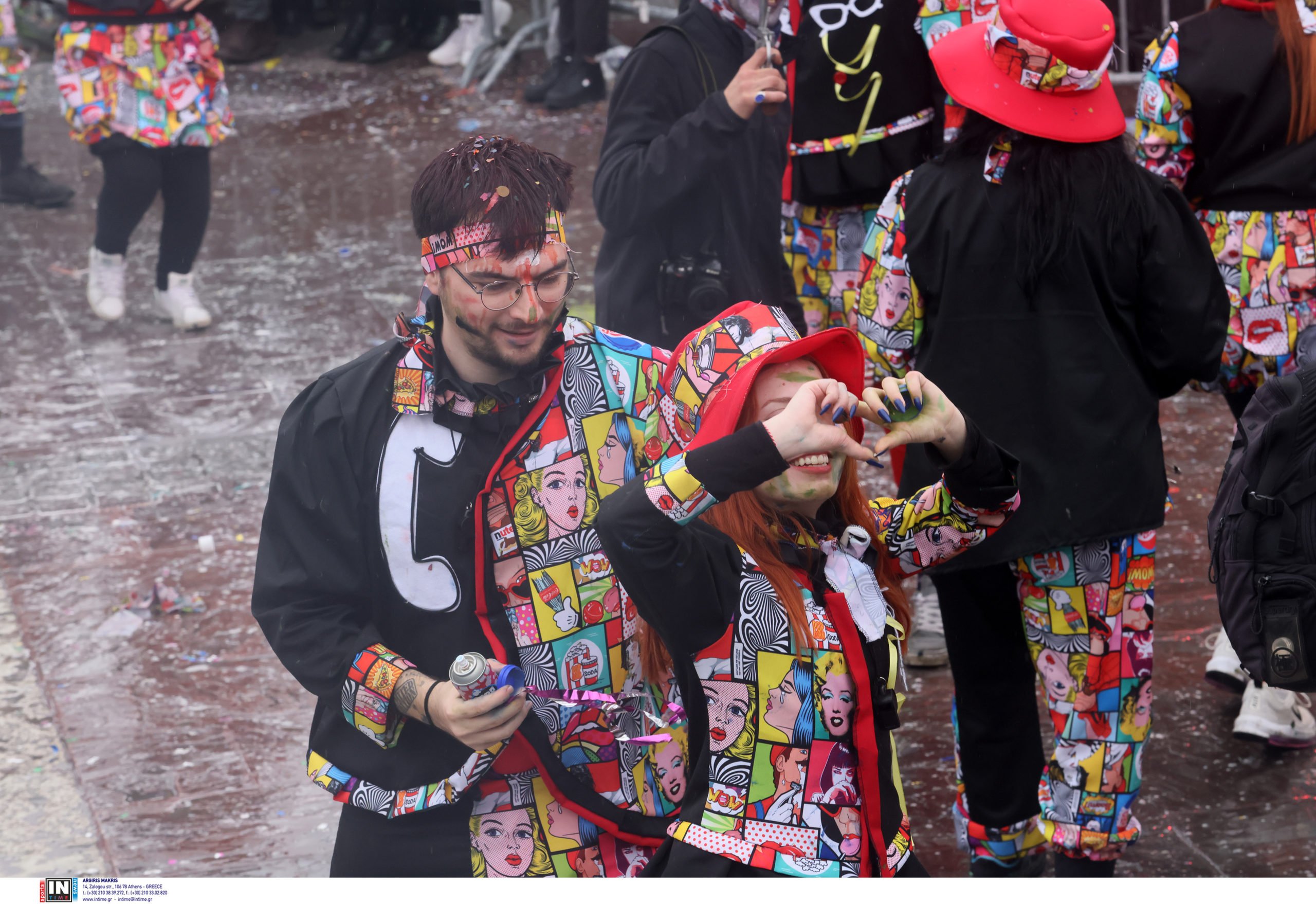 Από την καρναβαλική παρέλαση δεν θα μπορούσε να απουσιάζει και η καθιερωμένη πρόταση γάμου, η οποία πραγματοποιήθηκε και φέτος στην κεντρική πλατεία, με έναν καρναβαλιστή να σκύβει και να ζητά σε γάμο την αγαπημένη του.