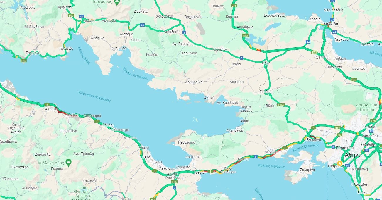 Στην εθνική οδό Αθηνών- Κορίνθου, με χαμηλές ταχύτητες κινούνται τα οχήματα στην Ελευσίνα, στα Μέγαρα, στους Αγίους Θεοδώρους αλλά και στο Δερβένι.