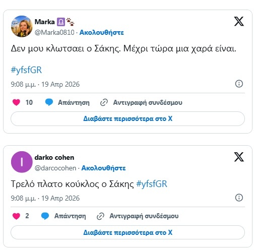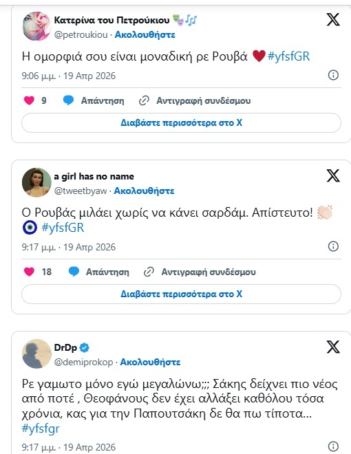 Η Τζώρτζια Συρίχα μέσα από το αποκλειστικό της ρεπορτάζ στο dedomeno.gr, γράφει χαρακτηριστικά: Σε μια τηλεοπτική πραγματικότητα που μοιάζει να ακροβατεί ανάμεσα στην έλλειψη φρέσκων ιδεών και την ανακύκλωση προσώπων, η επιστροφή του Σάκη Ρουβά στην παρουσίαση του YFSF, μόνο απαρατήρητη δεν μπορεί να περάσει.