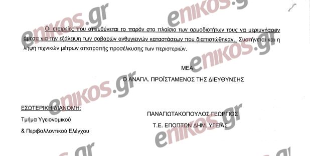 «Οι εταιρείες που απευθύνεται το παρόν στο πλαίσιο των αρμοδιοτήτων τους να μεριμνήσουν άμεσα για την εξάλειψη των σοβαρών ανθυγιεινών καταστάσεων που διαπιστώθηκαν. Συστήνεται και η λήψη τεχνικών μέτρων αποτροπής προσέλκυσης των περιστεριών», καταλήγει η Περιφέρεια στην απάντησή της.