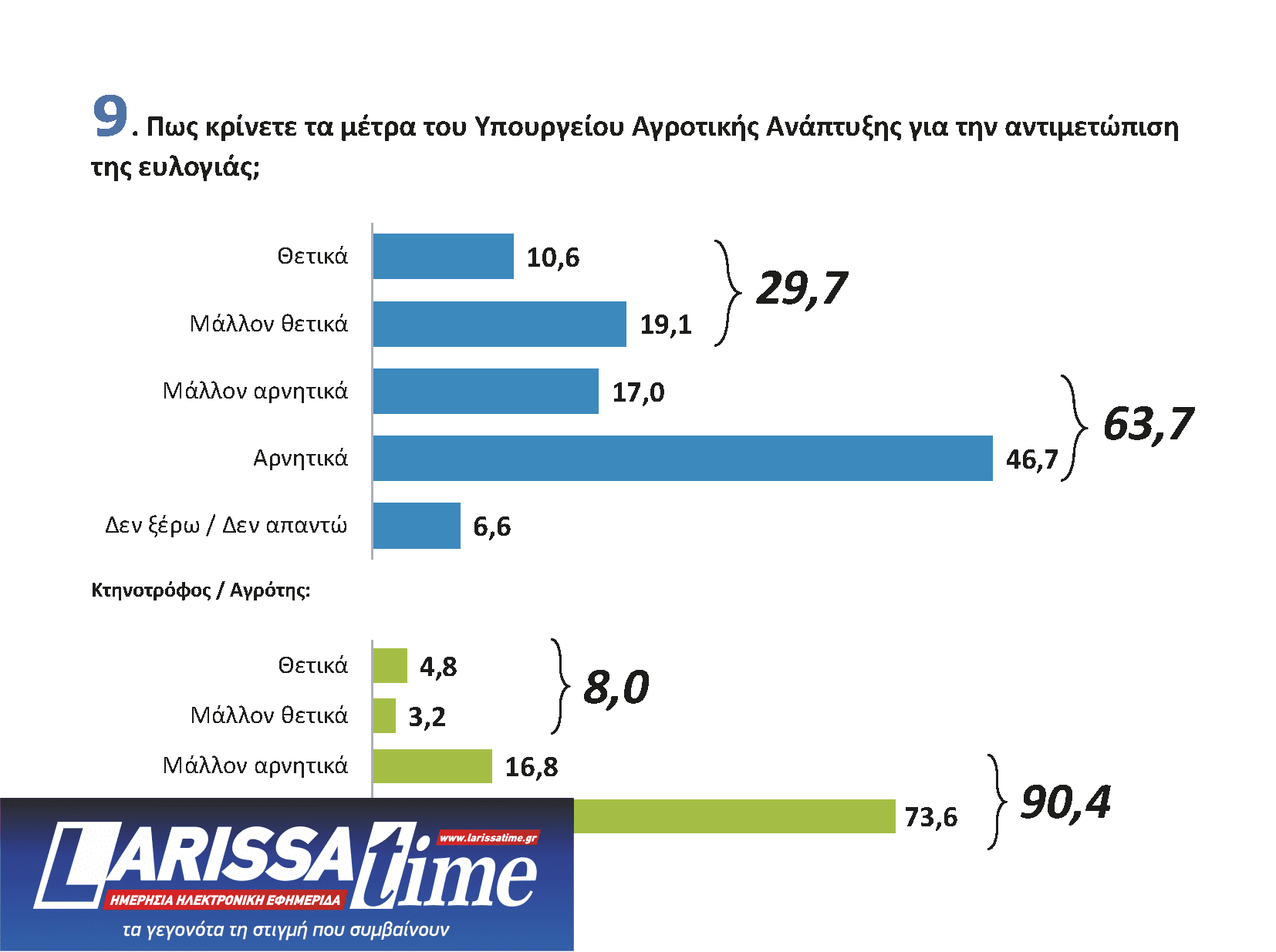 Όσον αφορά τα μέτρα που έλαβε το Υπουργείο, μόνο ένας στους τρεις τα θεωρεί θετικά. Ειδικότερα, το 29,7% εξέφρασε θετική άποψη (10,6% θετικά και 19,1% μάλλον θετικά), ενώ 63,7% τα χαρακτηρίζει αρνητικά (17% μάλλον αρνητικά και 46,7% αρνητικά). Άγριο ράπισμα καταγράφεται για την κυβέρνηση στους ερωτηθέντες αγρότες και κτηνοτρόφους, με το 90,4% να θεωρεί αρνητικά (73,6% ή μάλλον αρνητικά (16,8%) τα μέτρα που ελήφθησαν για την αντιμετώπιση της ευλογιάς.
