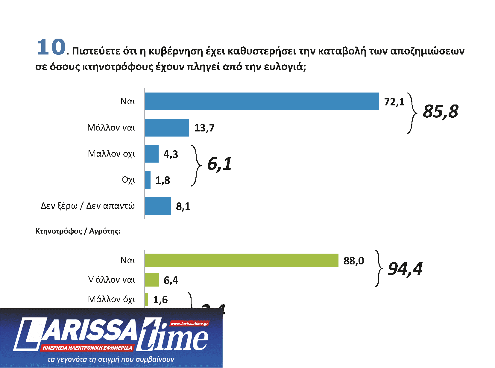 Στο σκέλος που αφορά την καταβολή των αποζημιώσεων στους κτηνοτρόφους που έχουν πληγεί από την ευλογιά, η συντριπτική πλειοψηφία, το 85,8% πιστεύει πως η κυβέρνηση καθυστέρησε να δώσει τα χρήματα στους πληγέντες. Μόλις 6,1% δίνει στήριξη στην κυβερνητική στάση στο συγκεκριμένο ερώτημα.