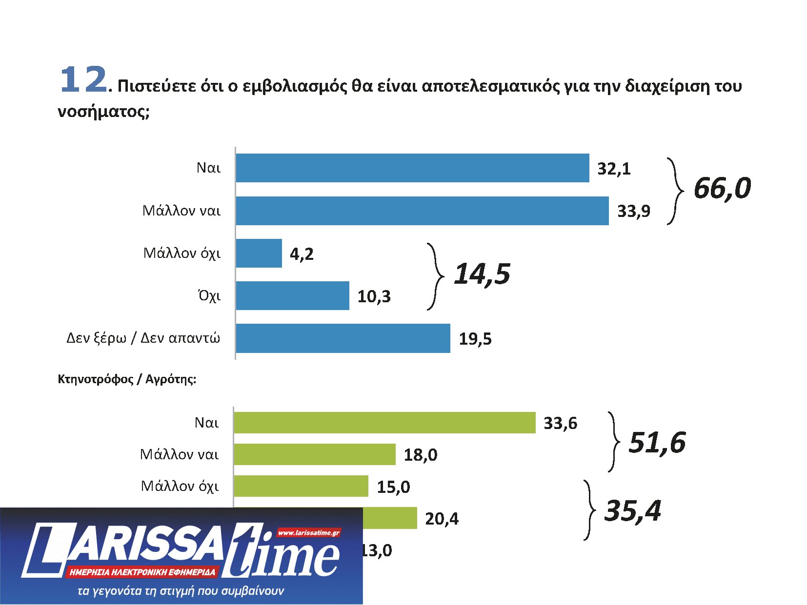 Στο κρίσιμο ερώτημα πόσο αποτελεσματικός μπορεί να είναι ο εμβολιασμός στη διαχείριση του νοσήματος, το 66% πιστεύει «ναι», ενώ από τους κτηνοτρόφους/αγρότες που απάντησαν συναινεί το 51,6%!