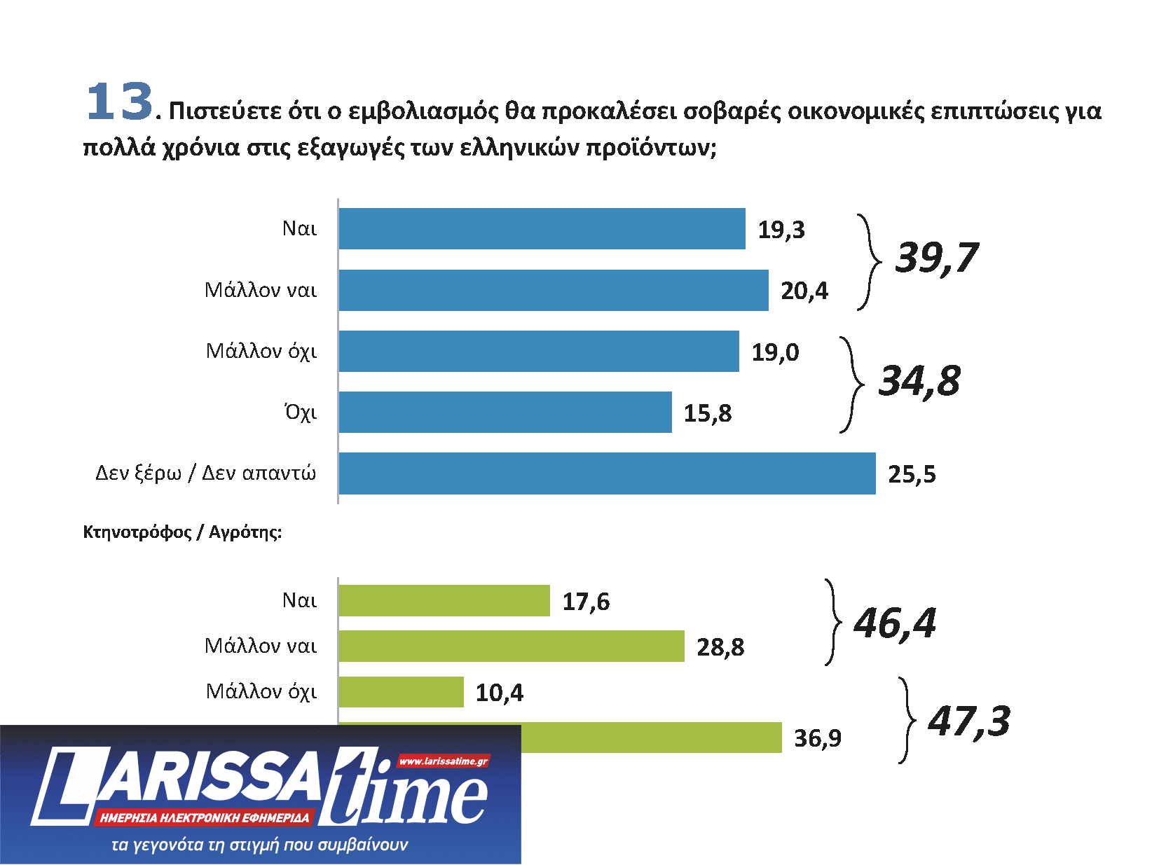 Στο ερώτημα που αφορά τις εξαγωγές των ελληνικών προϊόντων και τις οικονομικές επιπτώσεις που θα προκαλέσει ο εμβολιασμός, το 39,7% πιστεύει πως θα είναι σοβαρός, ενώ αντίθετη άποψη έχει το 34,8% και το 25,5% δεν απάντησε ή δεν γνώριζε. Στο ίδιο ερώτημα «διχασμένοι» είναι οι κτηνοτρόφοι/αγρότες με το 46,4% να θεωρεί τις επιπτώσεις σοβαρές και το 47,3% να δηλώνει «όχι»!