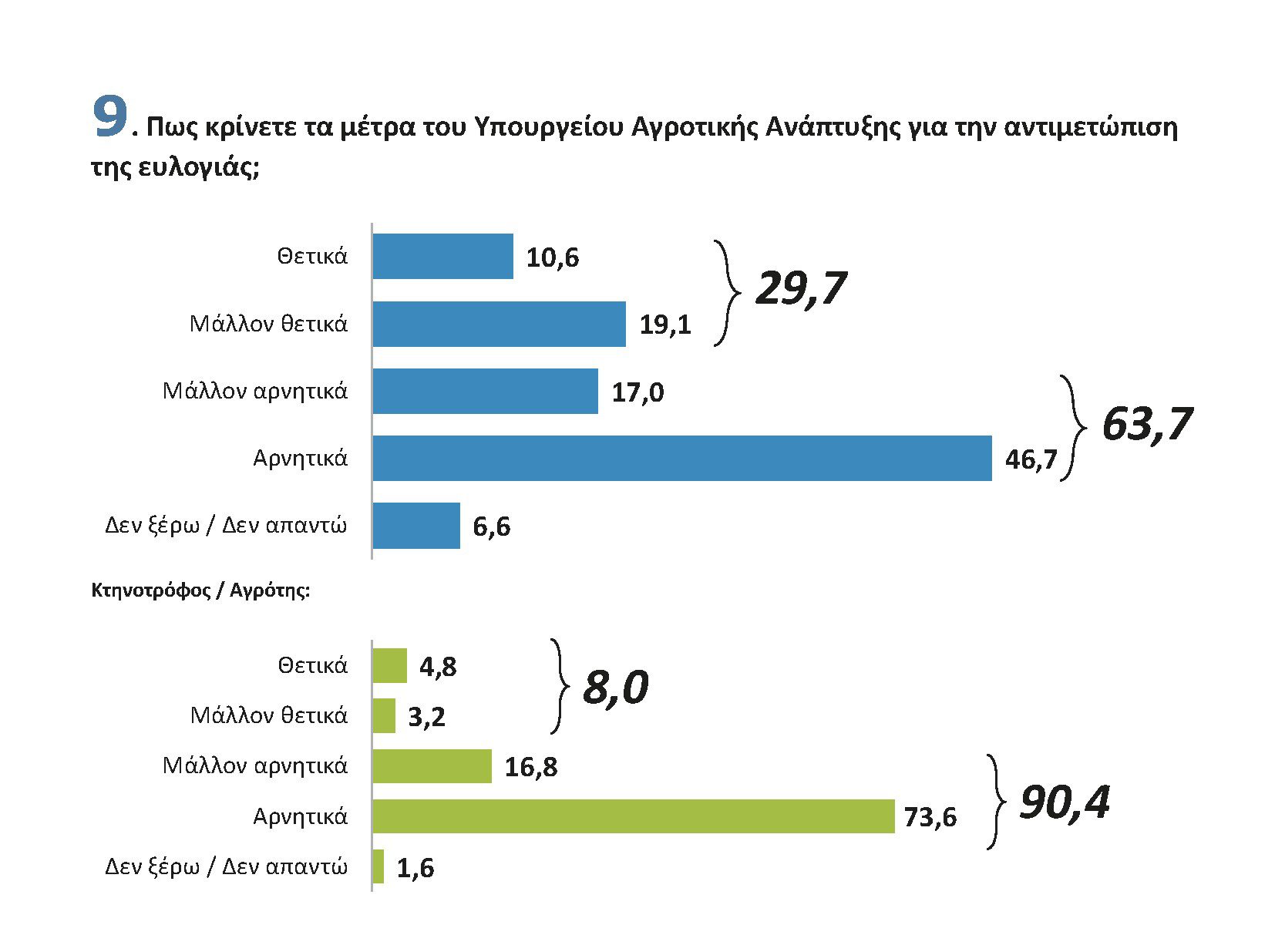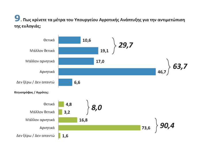 Όσον αφορά τα μέτρα που έλαβε το Υπουργείο, μόνο ένας στους τρεις τα θεωρεί θετικά. Ειδικότερα, το 29,7% εξέφρασε θετική άποψη (10,6% θετικά και 19,1% μάλλον θετικά), ενώ 63,7% τα χαρακτηρίζει αρνητικά (17% μάλλον αρνητικά και 46,7% αρνητικά). Άγριο ράπισμα καταγράφεται για την κυβέρνηση στους ερωτηθέντες αγρότες και κτηνοτρόφους, με το 90,4% να θεωρεί αρνητικά (73,6% ή μάλλον αρνητικά (16,8%) τα μέτρα που ελήφθησαν για την αντιμετώπιση της ευλογιάς.