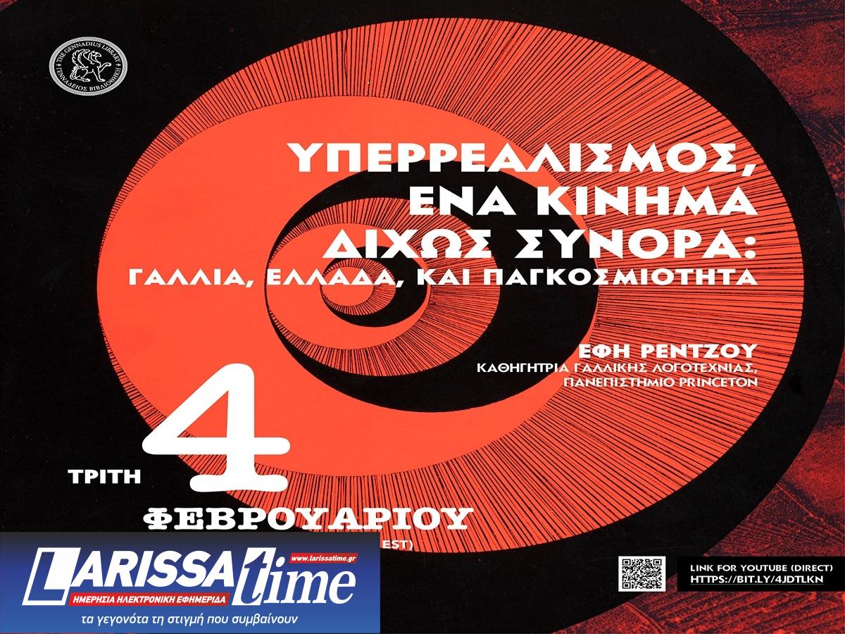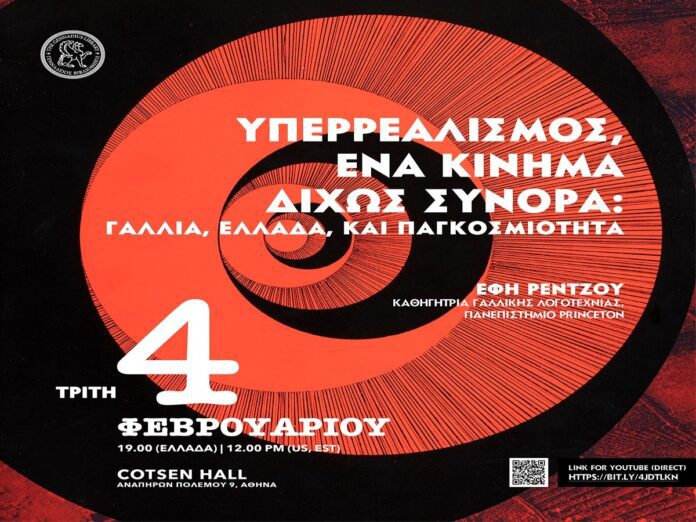 Η Αμερικανική Σχολή Κλασικών Σπουδών στην Αθήνα και η Γεννάδειος Βιβλιοθήκη διοργανώνουν διάλεξη της Καθηγήτριας Γαλλικής Λογοτεχνίας του Πανεπιστημίου Princeton, Έφης Ρέντζου, με θέμα “Υπερρεαλισμός, ένα κίνημα δίχως σύνορα: Γαλλία, Ελλάδα, και παγκοσμιότητα”.