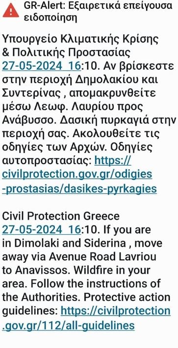 Υπενθυμίζεται πως νωρίτερα εστάλη μήνυμα μέσω του 112 σε όσους βρίσκονται στην περιοχή Δημολακίου και Συντερίνας στην Κερατέα να απομακρυνθούν προληπτικά από την περιοχή και να κατευθυνθούν μέσω της Λεωφόρου Λαυρίου προς Ανάβυσσο.