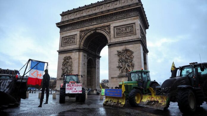 Οι Γάλλοι αγρότες κατέβηκαν μαζικά στους δρόμους του Παρισιού, διαμαρτυρόμενοι τόσο για τη συμφωνία ΕΕ–Mercosur όσο και για την αγροτική πολιτική της κυβέρνησης. Με τρακτέρ κατέκλυσαν κεντρικά σημεία της πόλης, εκφράζοντας την έντονη αντίθεσή τους.