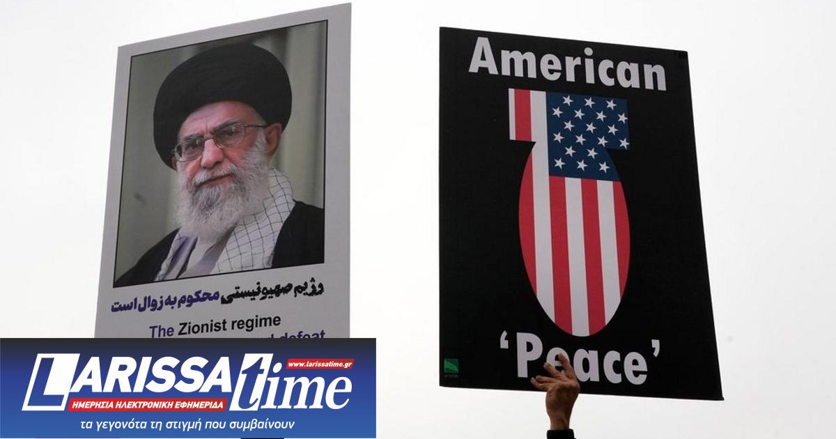 Ιρανοί διαδηλωτές κρατούν σημαίες της χώρας τους και πορτρέτα του ανώτατου πνευματικού ηγέτη του Ιράν Αγιατολάχ Αλί Χαμενεΐ, κατά τη διάρκεια αντιαμερικανικών και αντι-ισραηλινών διαδηλώσεων, στο κέντρο της Τεχεράνης, στις 24 Ιουνίου 2025.