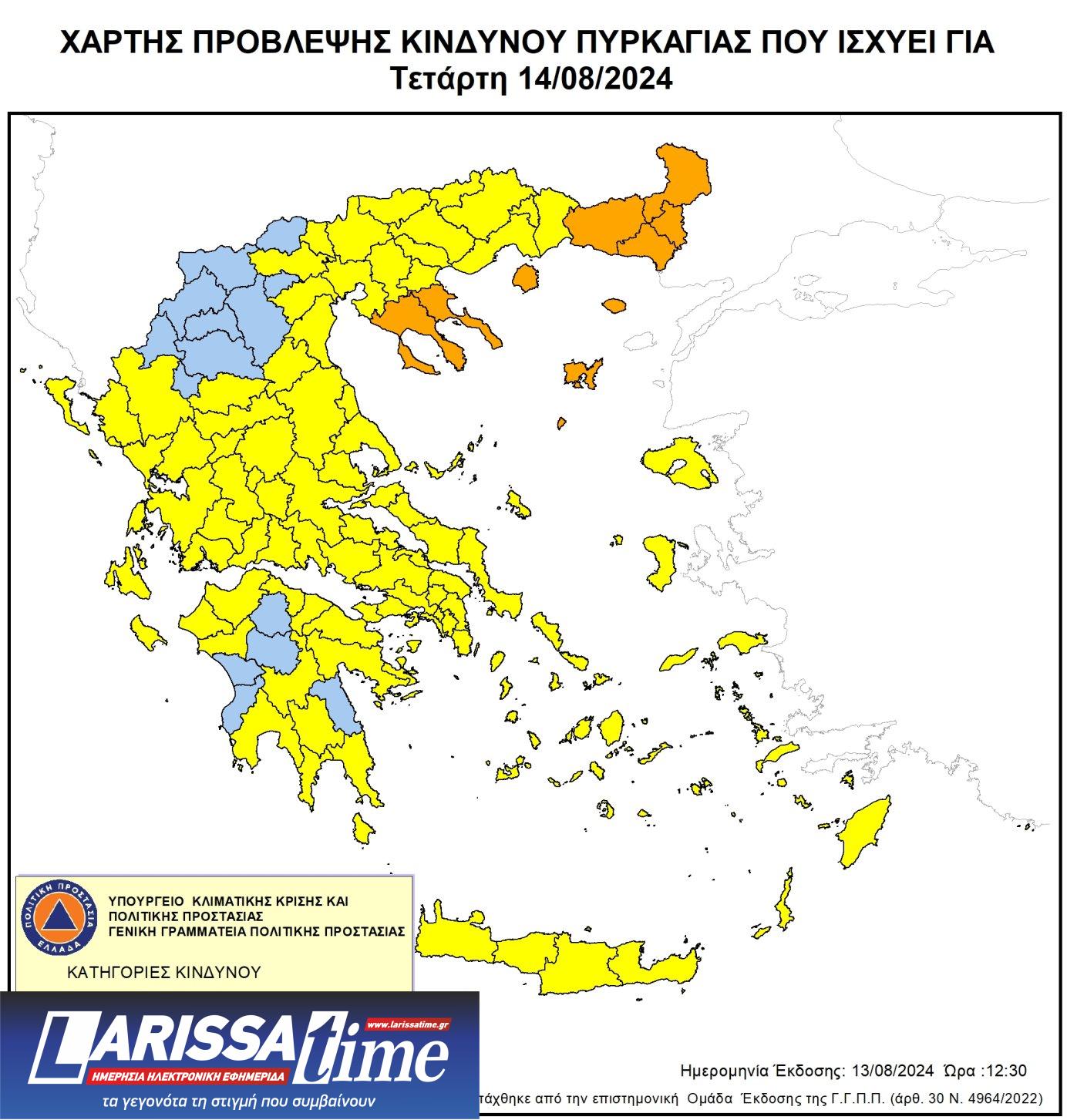 ⚠️ Χάρτης Πρόβλεψης Κινδύνου 🔥 για αύριο Τετάρτη 14/08: