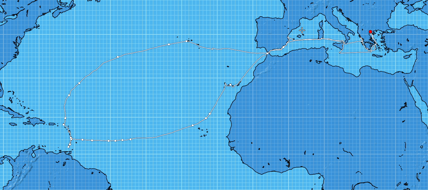 Τα πρώτα ναυτικά μίλια, αυτής της ιδιαίτερης θαλάσσιας διαδρομής, έγιναν στα γνώριμα νερά του Αιγαίου και του Ιονίου με το σκάφος, μήκους 40 ποδιών, να «κυλάει» πλάι από τα Κύθηρα και να εγκαταλείπει την Ελλάδα. Η απόσταση μέχρι τον τελικό προορισμό μεγάλη και οι στάσεις αμέτρητες. Μεταξύ αυτών, οι ταξιδευτές πάτησαν στεριά στη Μάλτα, στις Συρακούσες, το στενό της Μεσσήνης, στη Σαρδηνία, τη Βαλένθια και γιαλό γιαλό μέχρι το Γιβραλτάρ.